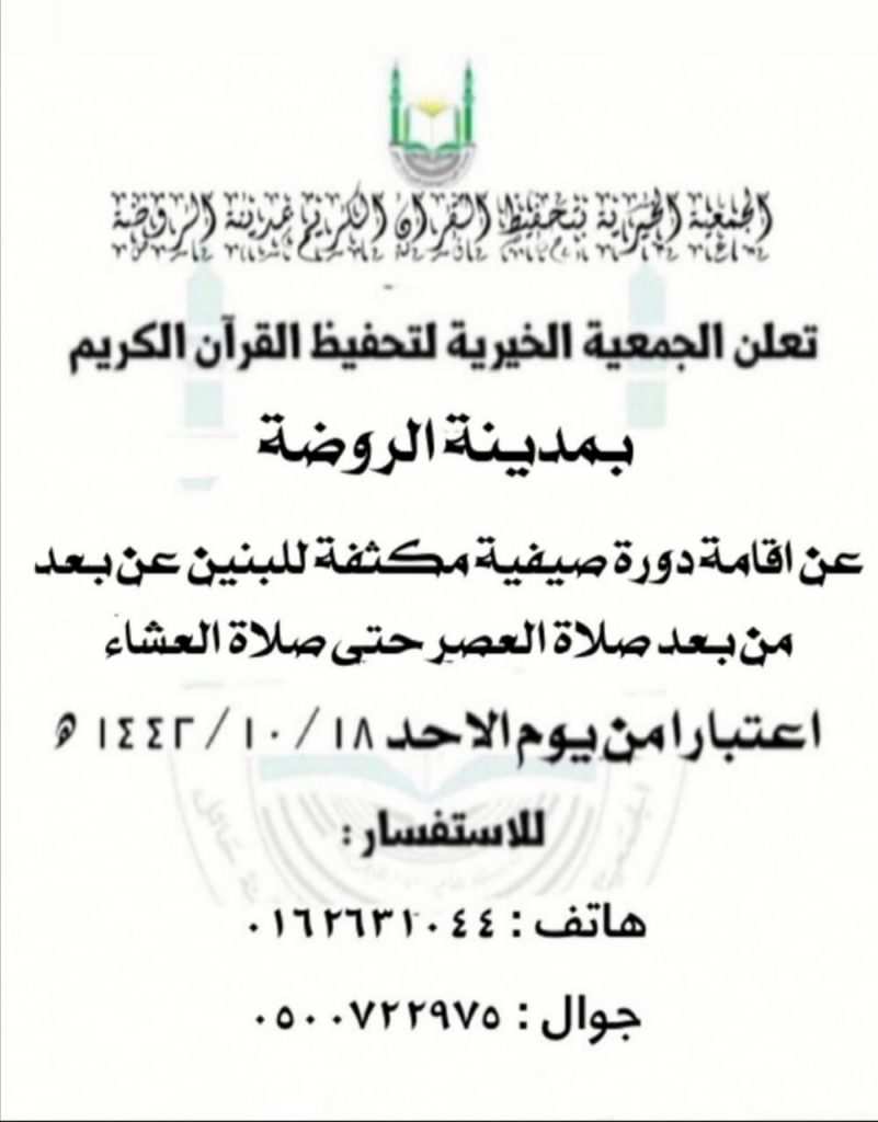 تعلن الجمعية عن إقامة الدورة الصيفية المكثفة لحفظ وتصحيح تلاوة القرآن في حلقة أسامة بن زيد بالجامع الكبير